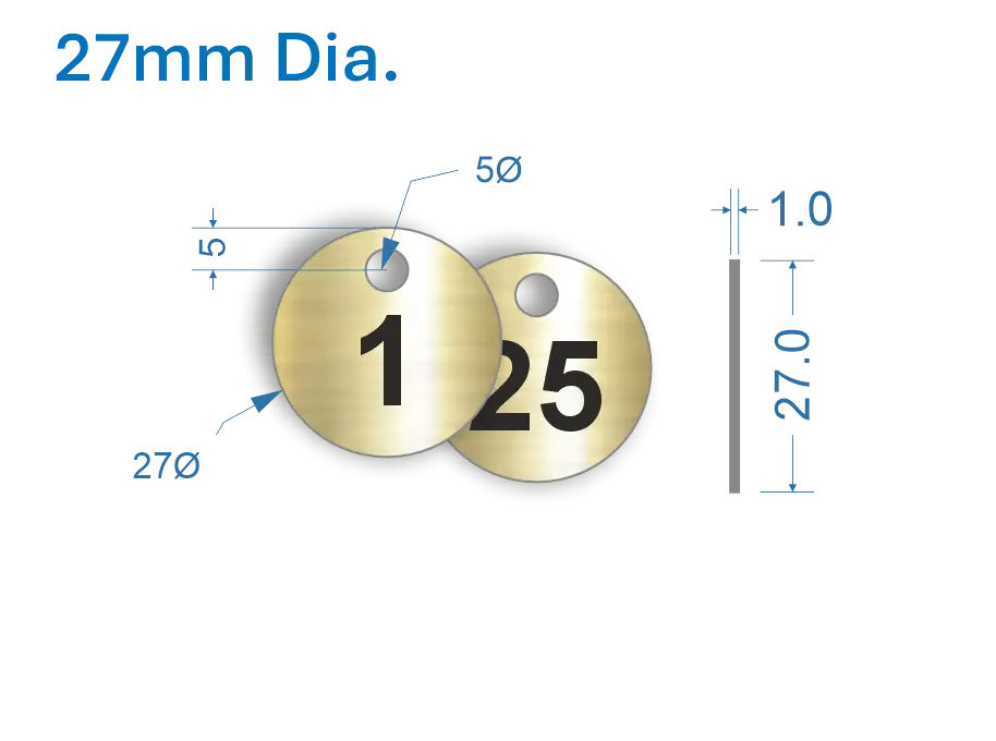 With a diameter of 27mm and a thickness of 1.0mm, these tags offer excellent visibility and sturdiness. A single 5mm hole allows for easy attachment. The tags are rotary engraved to a depth of 0.35mm, ensuring clear and legible numbering, with the option to include standard legends for immediate identification.