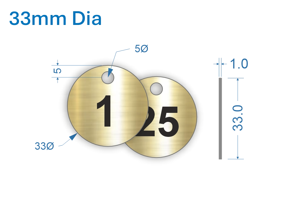 With a diameter of 33mm and a thickness of 1.0mm, these tags offer excellent visibility and sturdiness. A single 5mm hole allows for easy attachment. The tags are rotary engraved to a depth of 0.35mm, ensuring clear and legible numbering, with the option to include standard legends for immediate identification.