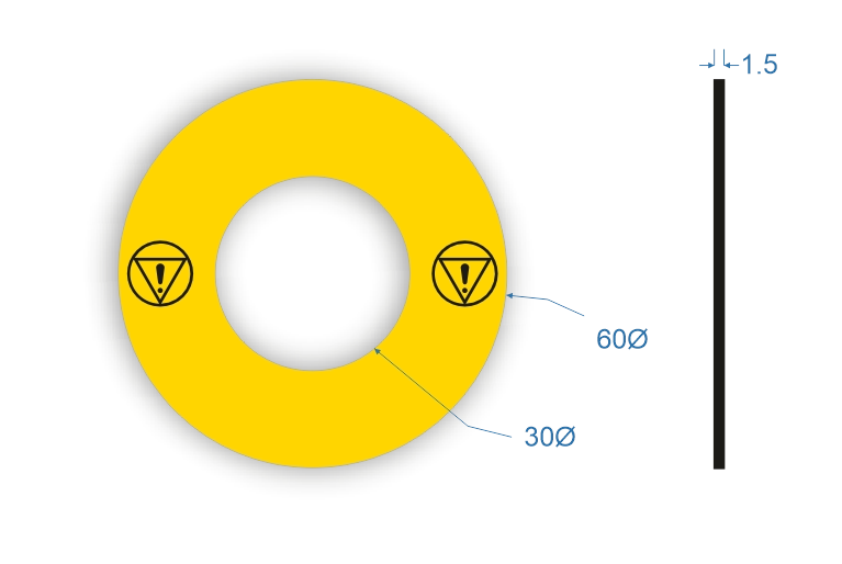 60mm diameter outer 30mm inter daimeter Traffolyte Yellow/black/yellow 1.5mm thick Emergency Stop (Caution Only) Labels. Pack of 10 Self-adhesive