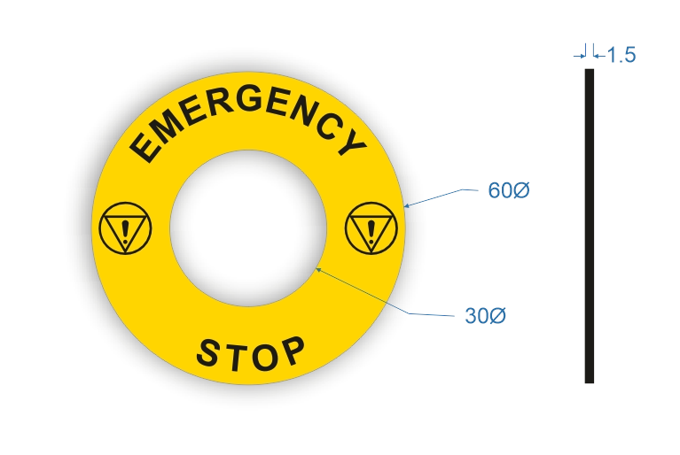 60mm diameter outer 30mm inter daimeter Traffolyte Yellow/black/yellow 1.5mm thick Emergency Stop Labels. Pack of 10 Self-adhesive